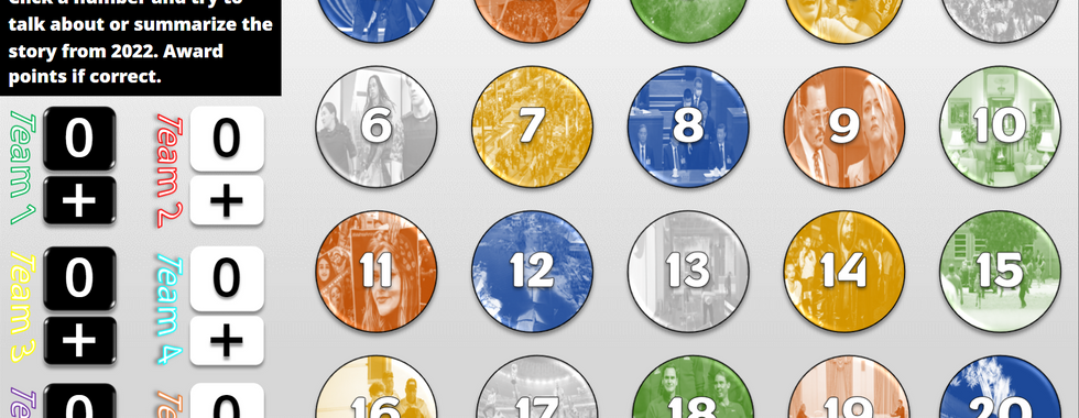 Ask students to choose one of the pictures then they must teach the story behind it. There are headlines you can reveal if no one knows the story. I award points for correct answers, but you can use this as a conversation starter and not worry about gamification.